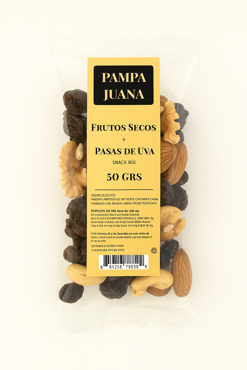 Mix de Frutos Secos y Pasas de Uva en packs de 50 Gramos.